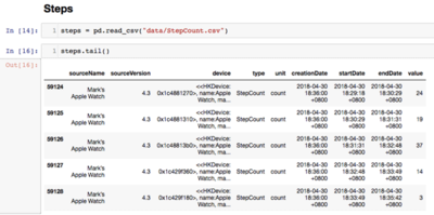 # %run -i 'apple-health-data-parser' 'export.xml' %run -i 'apple-health-data-parser' 'apple_health_export/export.xml' Sixth, select the cell and run SHIFT + ENTER: