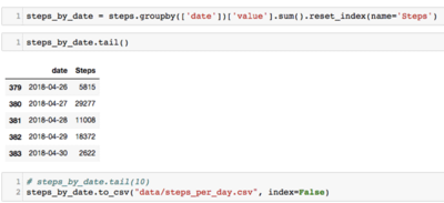 First, we group steps by the date and sum their value. We then create a new data frame called "steps_by_date." We can then see each date has a steps total and export it to CSV.