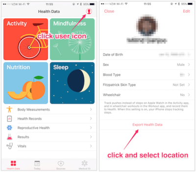 In order to get the raw export, go into the "Apple Health" app, tap on your user icon and then select "Export Health Data."