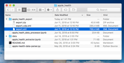 For our purposes, I'll be using Python 3 Code, which you can find here: https://github.com/markwk/qs_ledger/tree/master/apple_health. This code is based on In Defence of XML: Exporting and Analysing Apple Health Data and the Python 2 code found at: https://github.com/tdda/applehealthdata.